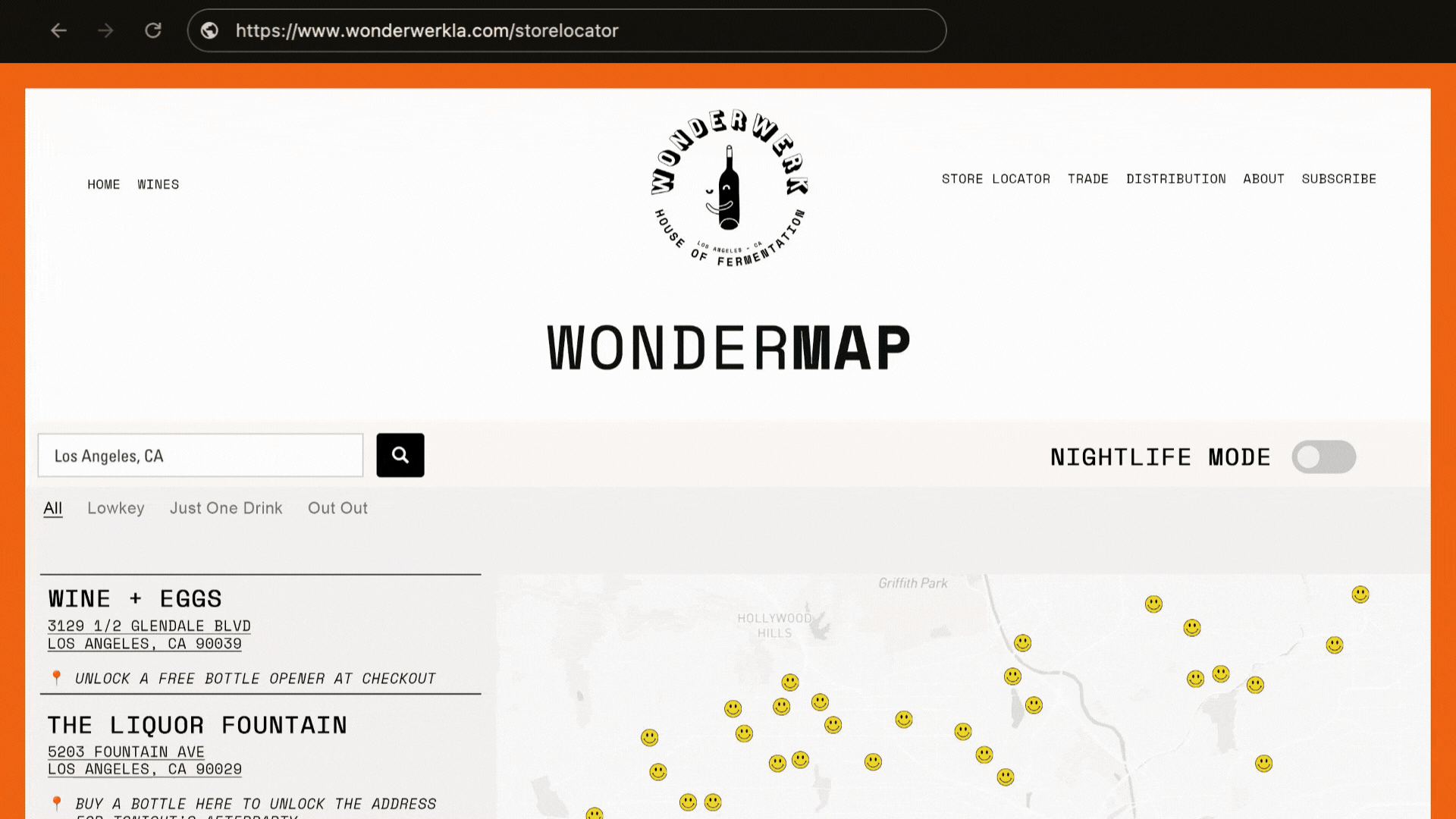 Wonderwerk needed a store locator. We refused to build a boring one. We created the WonderMap—a digital hunt that turns the simple act of buying wine into the first stop of the night. By toggling "Nightlife Mode," users reveal glowing hotspots of parties and pregames happening near stocked shelves. It’s not just about finding the wine; it’s about finding where the night is going.